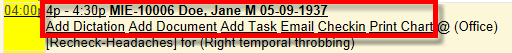 | SchAppointment Title Color | Background color of the 1 ^st line of the appointment – the "title" showing pt. name, DOB, time. | ![]() |